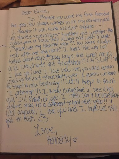 Sitting in bed, watching Netflix (SoA, probably), and I get a text from my bestfriend in middle school. I wrote this in her yearbook when I was in eighth grade and I’m kinda embarrassed. Thinking back on those times is so weird, and updating her on the people that we went to school with was even weirder! But so fun. You really get to see how much people changed by being in her shoes and imagining the last time you saw them before she moved! Now that we are all moving onto colleges around the country, I hope to get more texts like this! I enjoy remembering times like these (and how toned down I am about guys now I mean shoot).