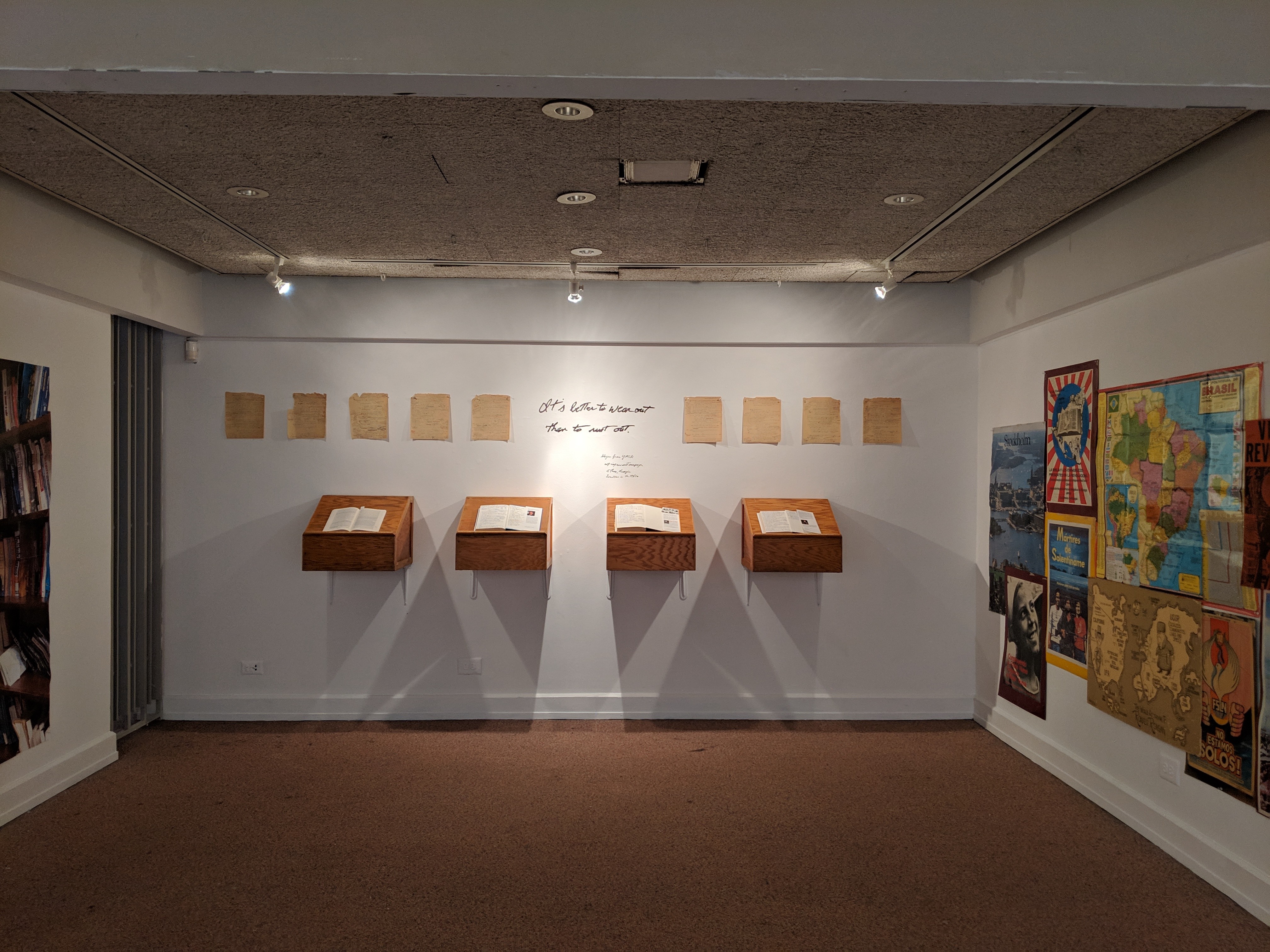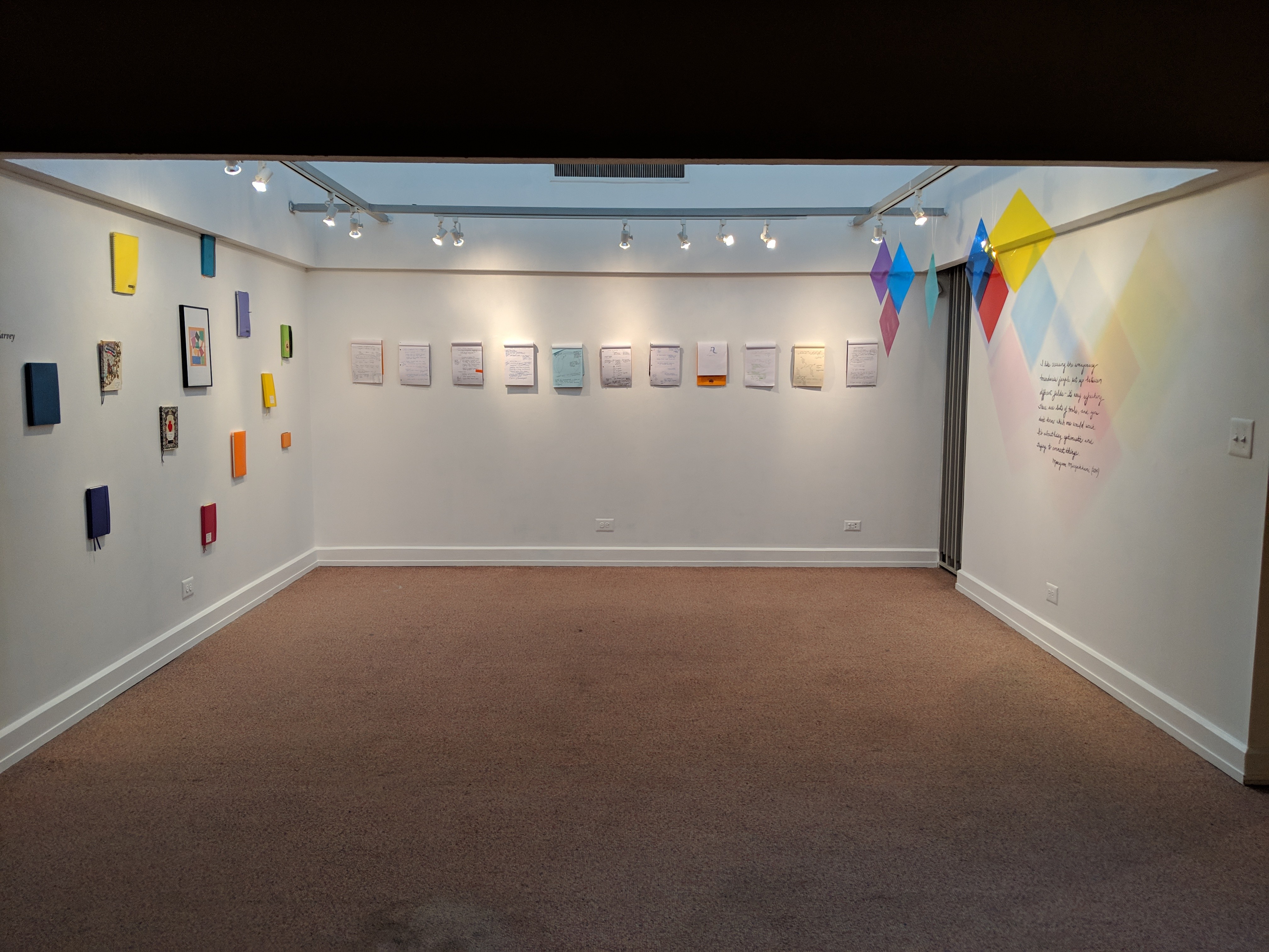 Vibrant colors were the theme in Professor of Chemistry Lilia Harvey’s room. Each notebook that she loaned to the gallery was a different bright color, so we asked Professor Harvey to loan one of her framed art pieces to act as the center piece for the bold moleskin notebooks. In a slightly more vulnerable tone, Harvey gave us permission to open some of her notepads and display her notes. Details of the notes included drawings, while some ideas were written in multiple languages. The wall with the quote was given a pop to the upbeat room, hanging gel squares from the ceiling so that the light can reflect color onto the wall.