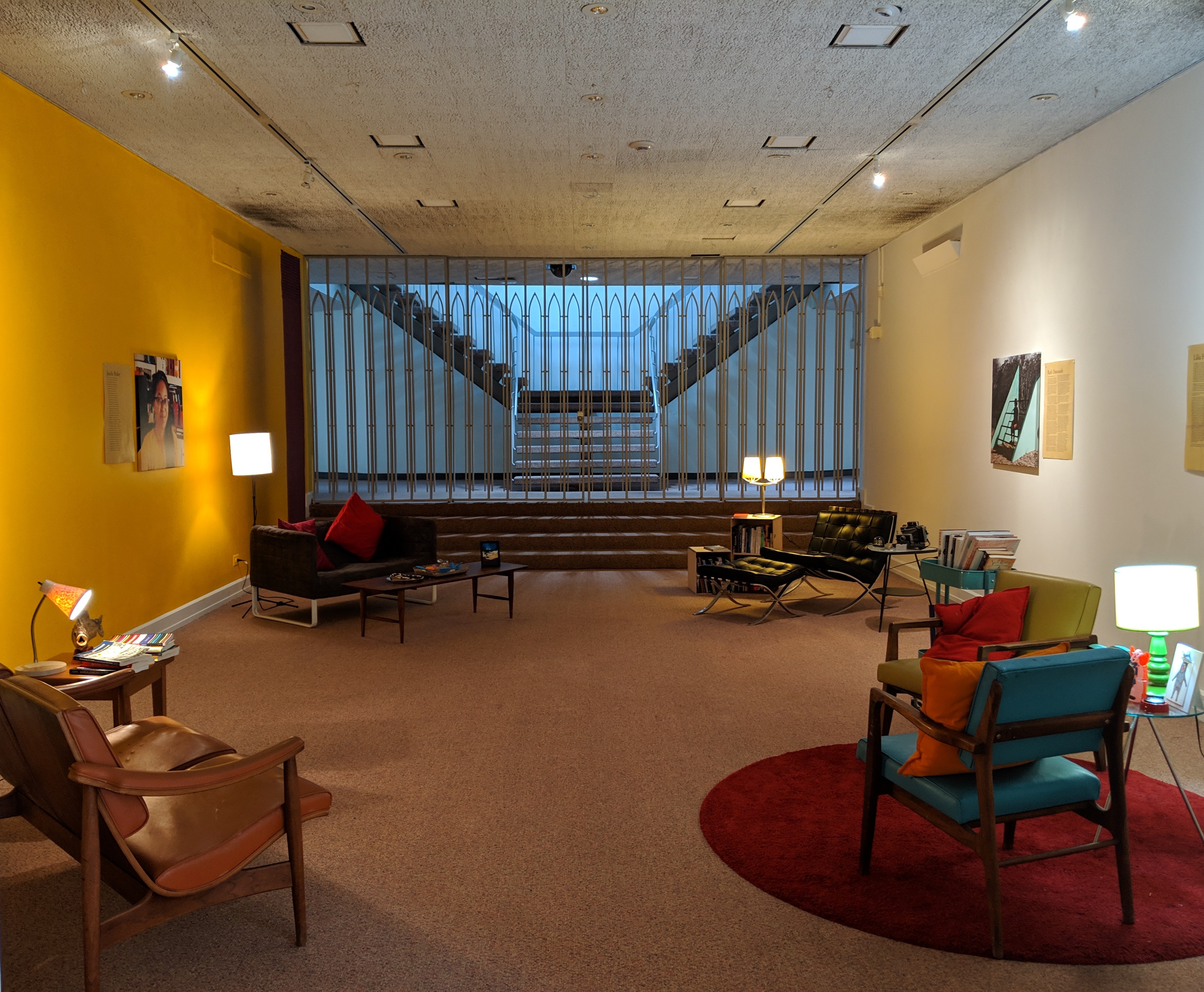 Visiting Professor of Art Ruth Dusseault’s room was purposefully stripped of color to offer a minimalist, 20th century experience. Vintage Van der Rohe chairs provide seating in front of two side by side projection screens. The left projection presents the French documentary Le Joli Mai (d. Chris Marker & Pierre Lehume, 1962). As a comparison, a slide show on the right projection loops the book Evidence by Mandel; Sultan (1977) documenting industrial and scientific evidence from private and public collections. On the far right wall, Dusseault’s sketches uphold the black and white aesthetic of the room– participating in a handcrafted, time warped utopia.