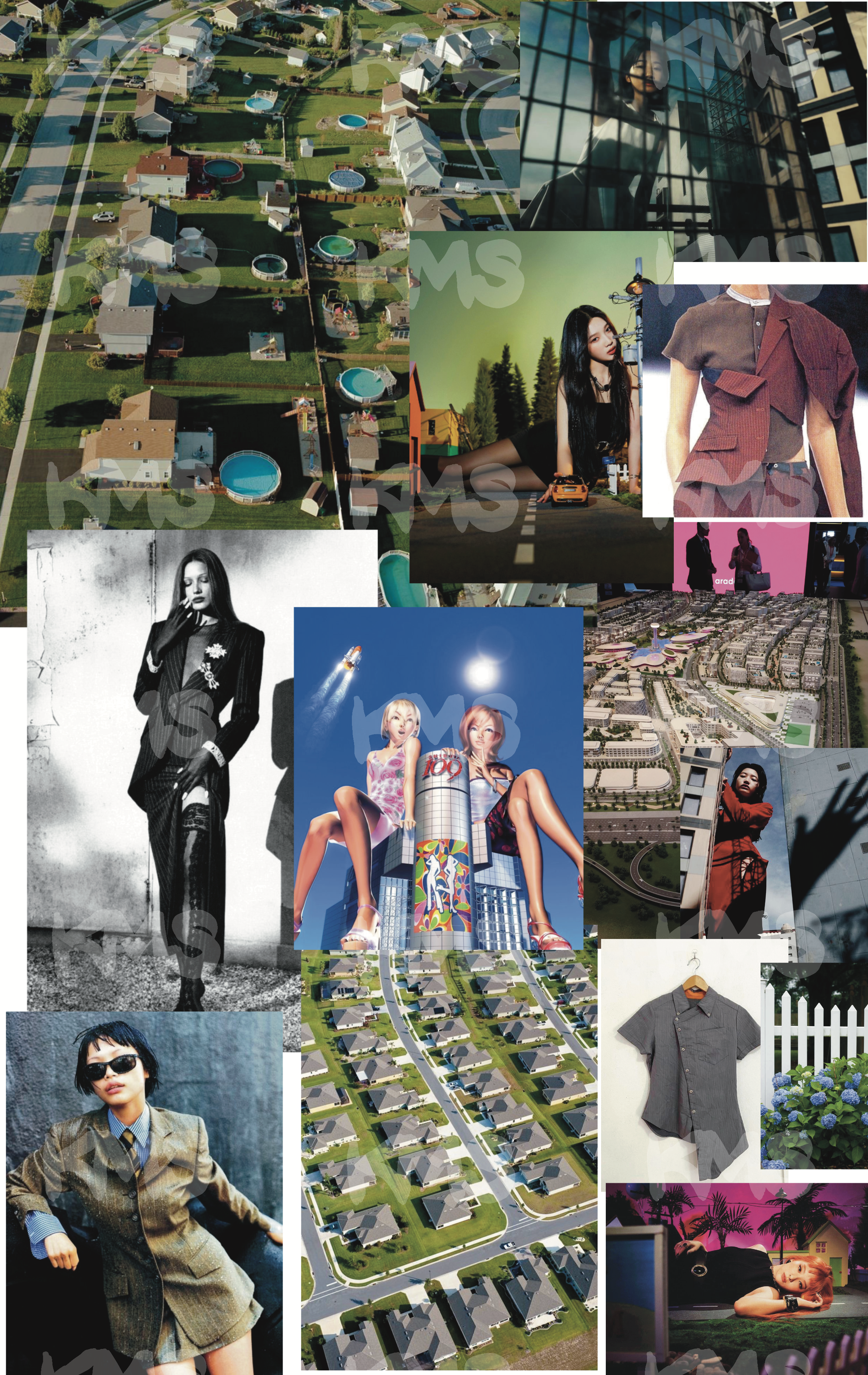 On to the set. I was inspired by those kid rugs that look like roads in a town where you can drive your Hot Wheels over. Rather than staging the garage as an office, why not be giants stomping through a pristine suburb (with their careers in the city buildings in the back corner)? I had a light bulb moment of Lana Del Rey’s cover of “Doin’ Time” by Sublime. The entire music video was her leisurely walking through LA, dressed in the undeniable 2014 mini sundress and braided sandals, while she was as tall as the skyscrapers.