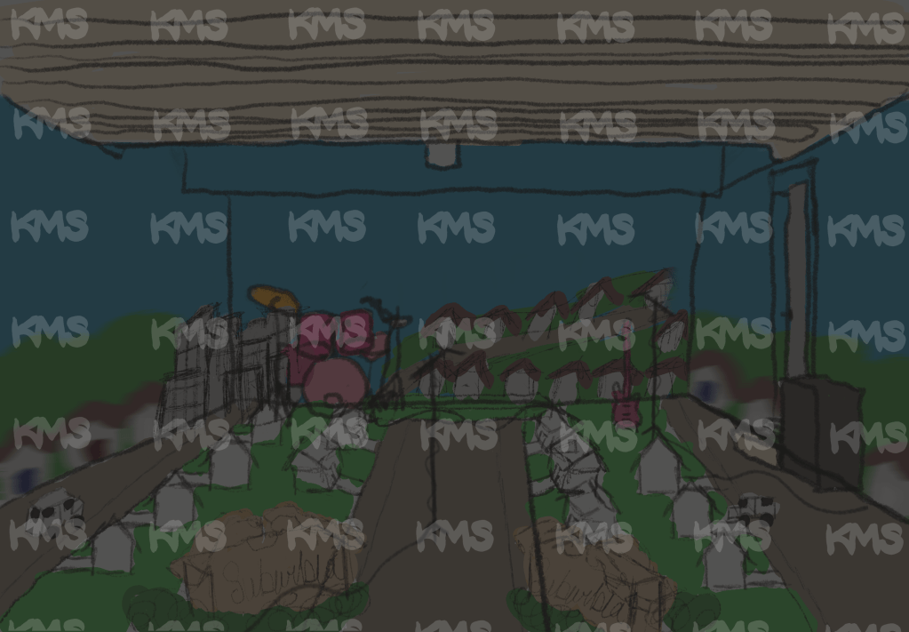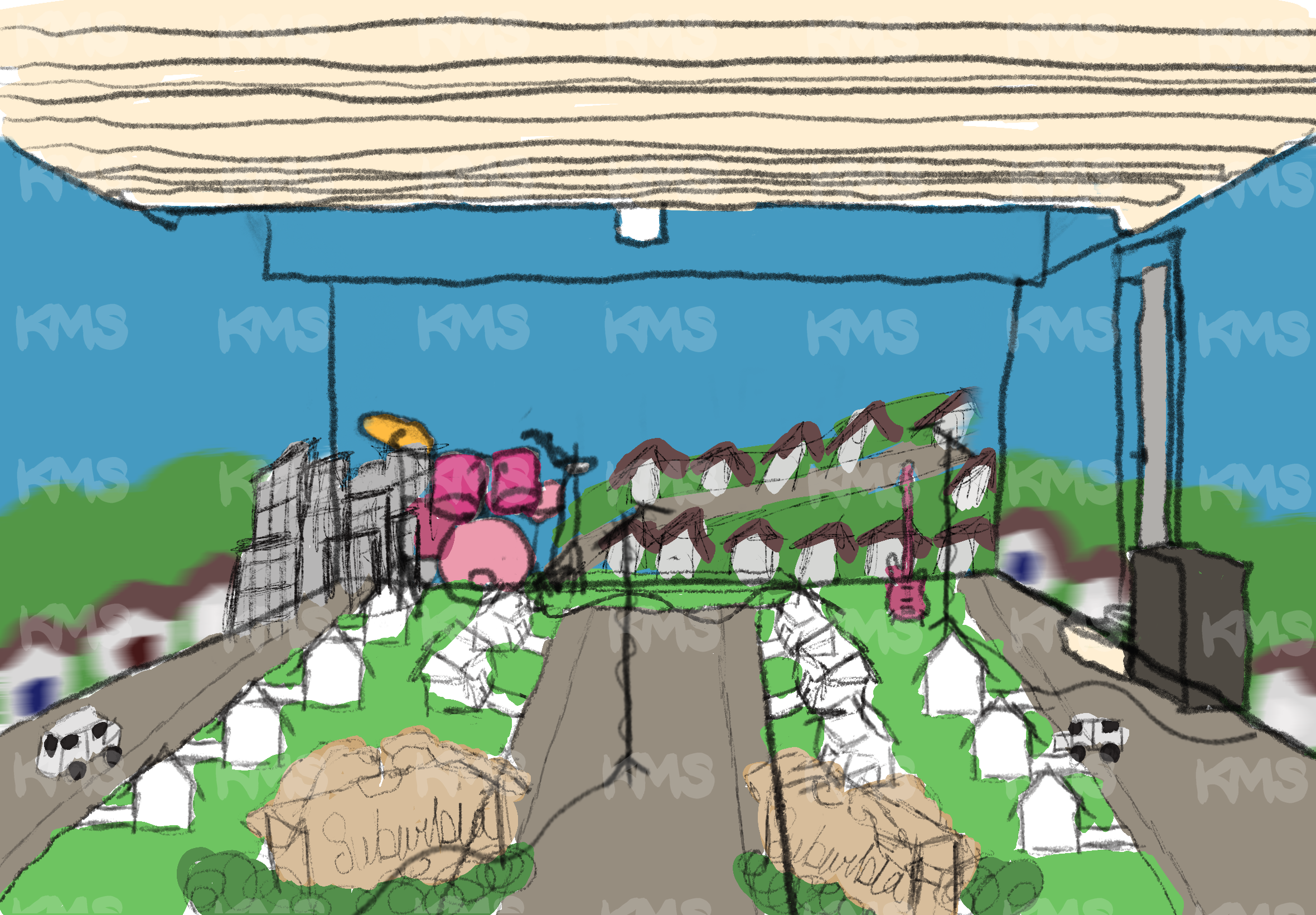 It’s not in the film, but at the end of the song there is a guitar & drum solo for twenty seconds. Right before this moment, the lights will turn out suddenly, not like the natural movement of the sun, but rather an artificial, cookie cutter, office– blah blah, you get the point. The end of the work day in the office. As the guitar solo continues, a projector will begin playing a series of statistics and images about: stolen land, the impact of deforestation, unoccupied residences in comparison to the unhoused crisis, etc. It will all be cohesive, cited, and relevant to the suburbs (maybe with commentary on how a lot of white people are moving back into the cities again, which will in turn push everyone else back to the suburbs).