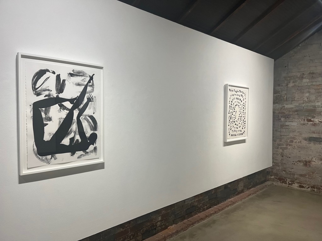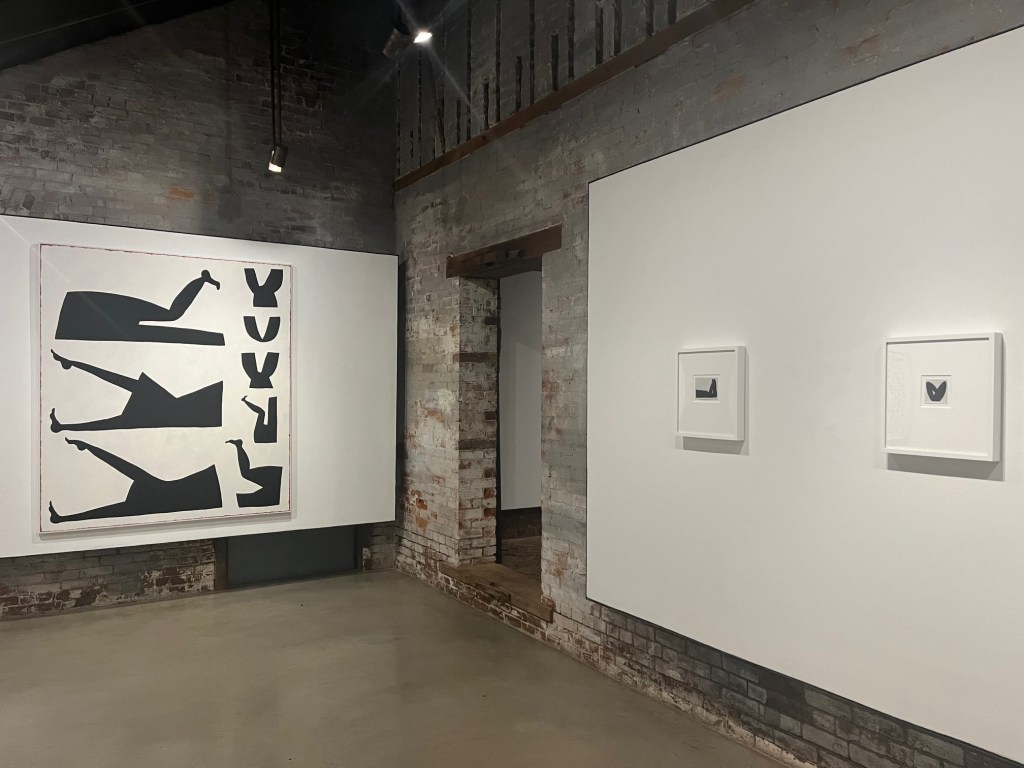 During the thirty-minute film, I needed fresh air among the fresh air. I stepped out to breathe away from the crowd and took a lap around the solo exhibition, This Fragile Thing by Amy Pleasant. Every letter of the exhibition title is the silhouette of a body part– the lowercase “h” is a reclined torso, the lowercase “r” is a wrist with a flopping hand, the uppercase “F” is the profile of a thigh and butt, perhaps?