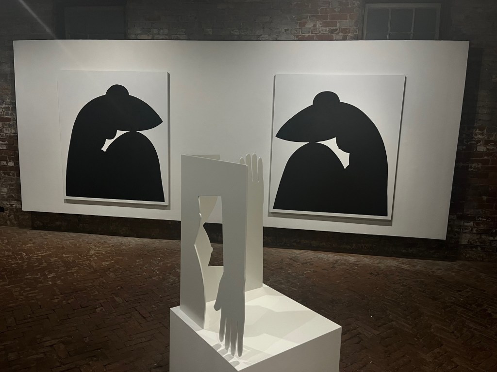 The modernized brick and wooden form of the gallery just after sunset was the perfect setting for these solemn pieces. Black silhouettes of naked bodies that bend and twist and lean were mostly created on gouache on paper… some in more natural poses, like the 62×108 inch diptych titled DoubleProp, where a single figure is seated in each panel facing one another. Their knees are to their bare chest with their arms folded on top of the knees and torso beginning to drape over the legs. I know this pose very well, and so does my shower floor after tiring days that leave me reeling. Other works have figures in less natural positions. The first piece on the left when one enters the gallery is titled Collapse XIII, a figure that is seemingly falling in mid-air towards an unknown destination. I also have known this pose well, being known by several friends in college as someone who can literally fall anywhere. Fallen could be the answer to Collapse XIII‘s question, where eight silhouettes have already hit the ground at different angles.